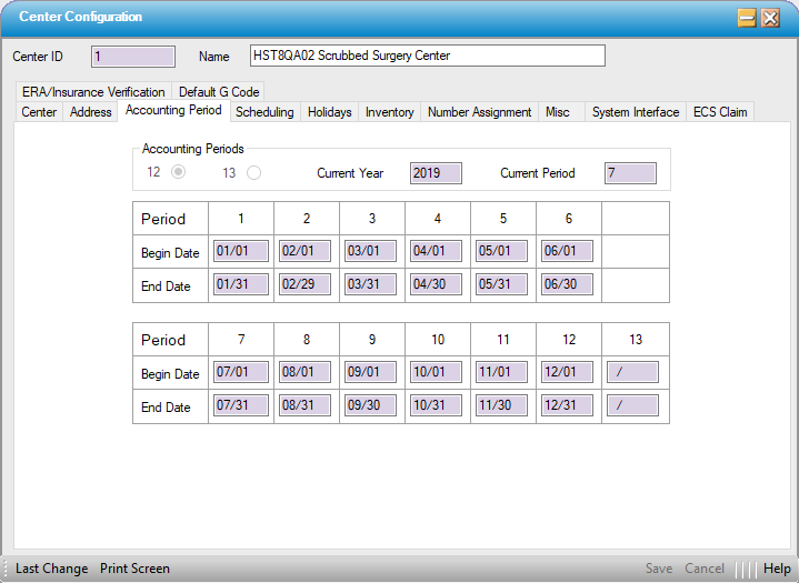 The beginning and ending dates of each accounting period are defined in Administration > Center Configuration > Accounting Period tab.