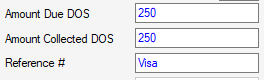 The Amount Collected DOS field can be completed to indicate how much was collected from the patient on or prior to the date of service, and it is followed by a Reference field in which the method of payment can be recorded.