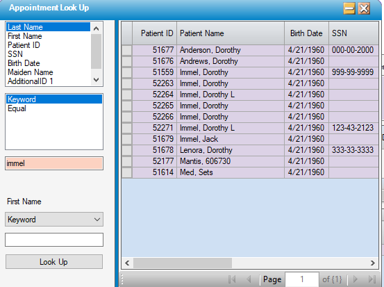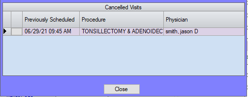 When rescheduling a previously canceled appointment, use the patient lookup. If HST Practice Management finds a prior canceled visit for this person, the Canceled Visits grid will pop-up, from which the appointment can be reinstated by clicking the grey box to the left of the previous date.