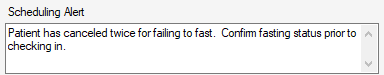 Click on the Scheduling Alert! hyperlink and a pop-up will display the alert that was entered in Case > Registration > Patient Demographics.