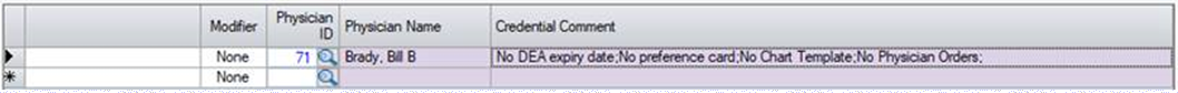 The Credential Comment section of the scheduling grid will indicate whether a physician’s credentialing has expired or whether a procedure has been scheduled for which the physician selected has no Preference Card. Warning messages specific to HST eChart include ‘No Chart Template’ and ‘No Physician Orders’ when these fields are missing within Physician Preference card set up.
