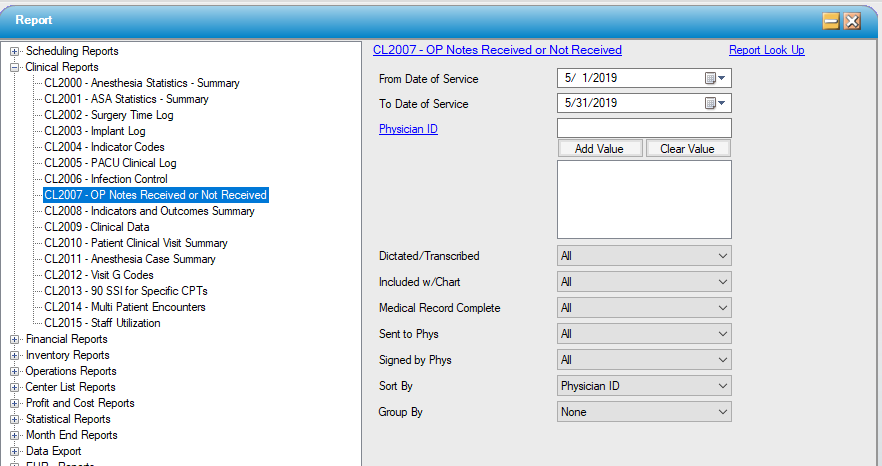Filter the report based on date of service range (default is the current month), or specified Physician ID(s), and by the following flags (yes or no): Op Notes dictated/transcribed, Included w/Chart, and Medical Record Complete.