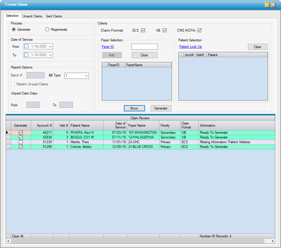 HST Practice Management Claims Generation was designed so that users could generate all eligible claims in one step.  ECS, CMS, and UB claims are generated simultaneously and then divided into batches based upon the format for transmission and/or printing.