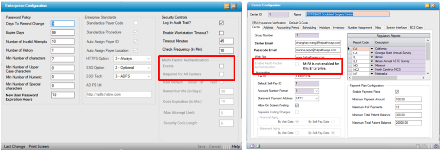 This check box defaults to OFF and is optional. This option defines if all Centers are automatically opted in for MFA or they can be opted in individually. When Require for All Centers is OFF and Enable is ON, each Center in the Enterprise can access Center Configuration and turn MFA ON or OFF for the Center without HST Support intervention. When Require for All Centers is ON and Enable is ON, all Centers are automatically Opted in for MFA and it cannot be turned OFF at the Center Configuration level. See Center Configuration for more details. This option allows Enterprise Administrators, where there are many Centers, to turn on MFA at each Center incrementally to help to avoid a large influx of calls to their help desk for user access issues. See the Before You Begin help file for information on rolling out M-FA. |