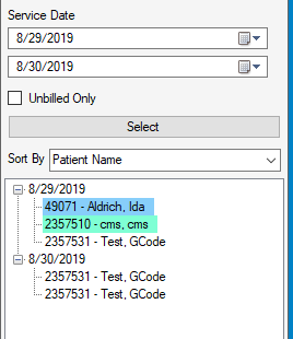 beside any date in the tree view to display and select the cases to be billed for that date.