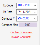 - Verify/add the Tx Code, Tx Date, and Contract # as applicable. Any of these fields can be edited by manual entry or selecting from the drop-down.