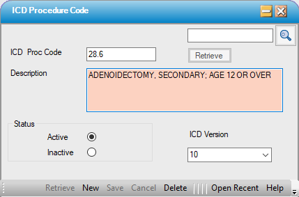 - Enter the ICD Procedure Code to be inactivated and select retrieve, or select the magnifying glass to search by Description or ICD Proc Code.