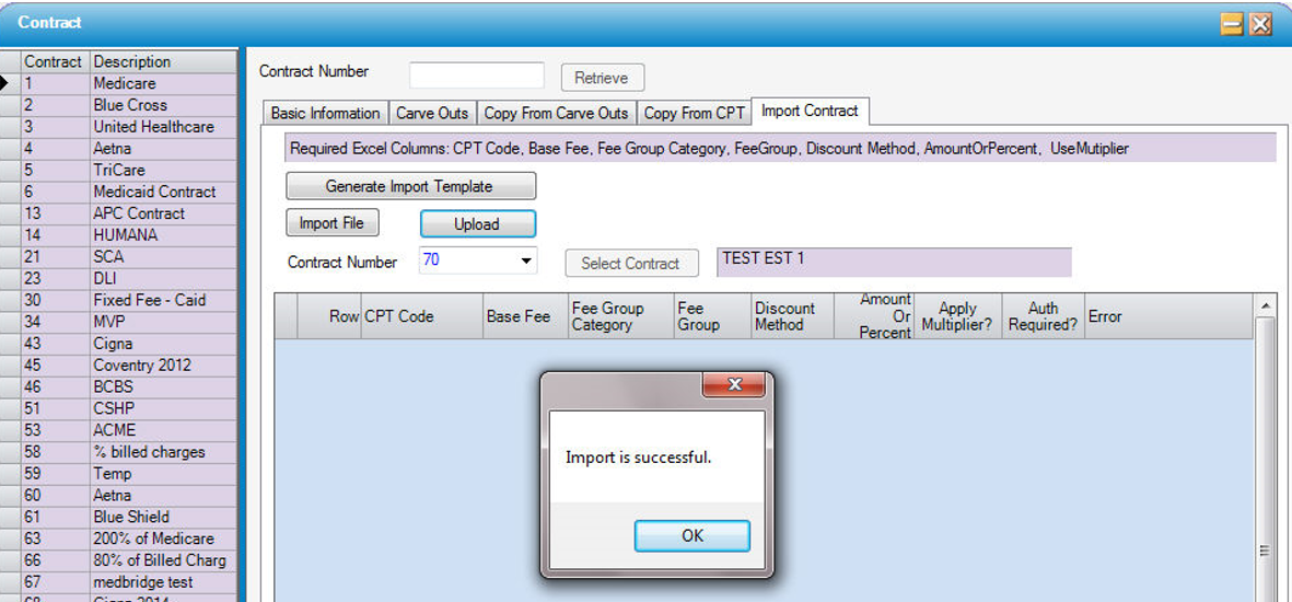 Clicking this button will generate the template needed to import contracts. This template is in a spreadsheet format that requires CPT Code, Base Fee, Fee Group Category, Fee Group, Discount Method, Amount or Percentage, and (Y/N) Multipliers.