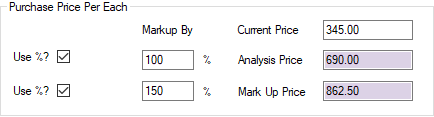 The Purchase Price Per Each section provides the ability to record the cost of the item and calculate prices for both analysis and billing.