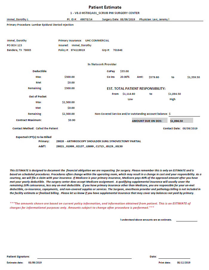 • Hide Low ($) Estimate - Will display only the High ($) Estimate on the printed Patient Estimate.
