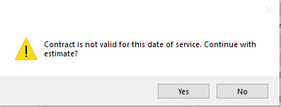 If a contract was inactivated or the date of service does not fall within the effective date range of the contract, a pop up will appear when the Estimate button is selected stating this and asking whether to continue with the estimate. If Yes is selected, no Contract Fees will populate. If No is selected, the pop up will close and user can update the contract prior to running the estimate.
