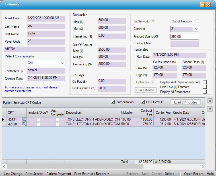 NOTE: The system will maintain only 1 Estimate at a time. In order to change anything other than Amount Due on DOS, the estimate must be deleted and run again after the changes have been saved.If the insurance is changed on the Payer Information tab, the system will automatically delete the existing estimate.