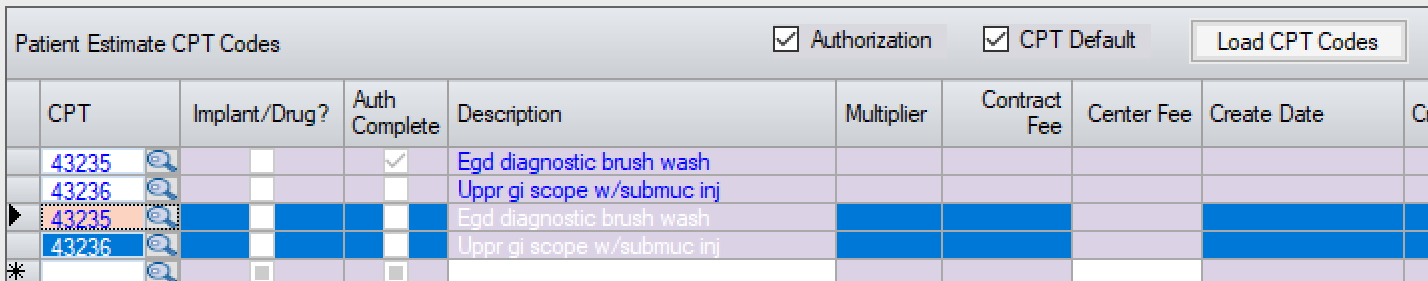• All CPT and HCPC codes entered in the Authorization Info tab will be loaded into the Estimate, whether or not the Auth Complete? box was checked, but the Auth Complete column will indicate those codes for which authorization was completed.