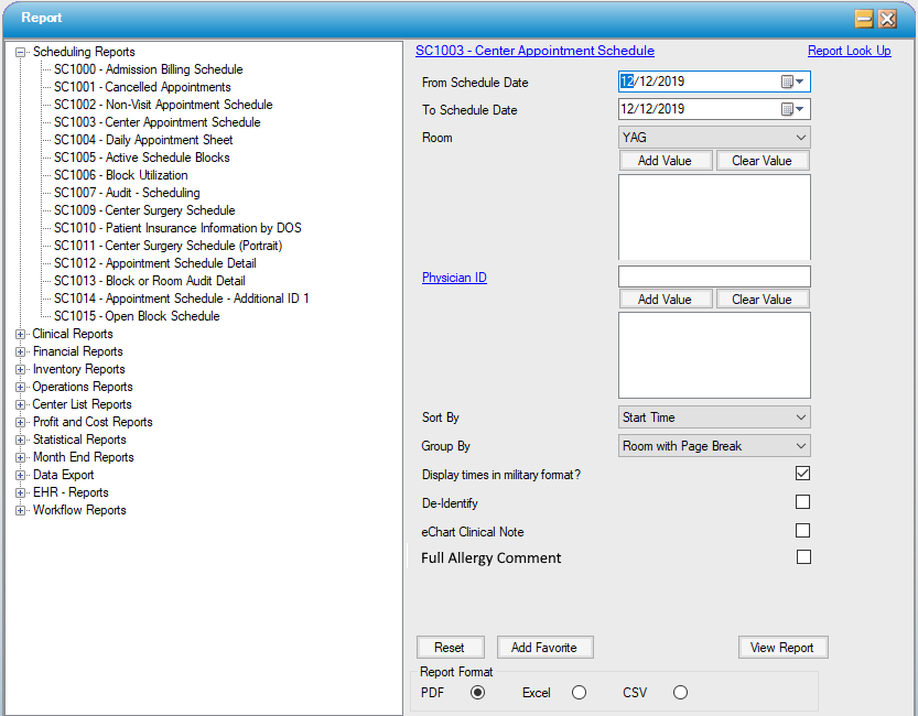 Enter the desired scheduled date range; select by specific room(s) or physician ID(s) if applicable.