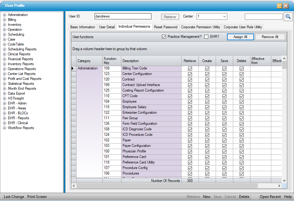 NOTE: Assign All and Remove All will assign or remove all available permissions based upon which corresponding check boxes have been checked. Checking Practice Management? and selecting Assign All will assign all Practice Management permissions. Likewise, checking EHR? and selecting Assign All will assign all eChart permissions. Checking both of these boxes will assign all permissions for both.