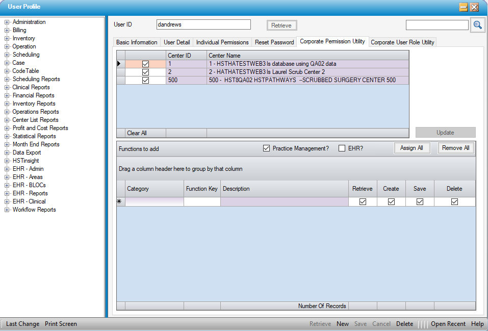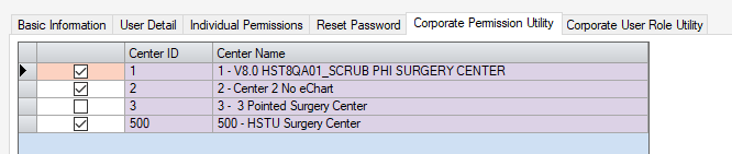 This additional tab allows users to be assigned individual permissions for multiple centers simultaneously.
