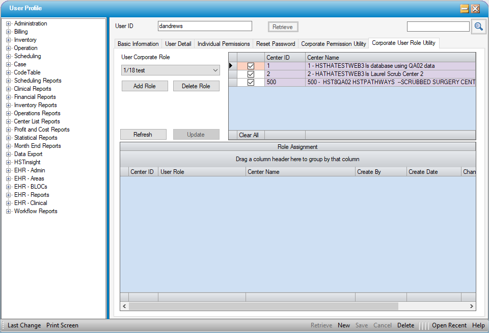 This additional tab allows users to be assigned User Roles for multiple centers simultaneously.