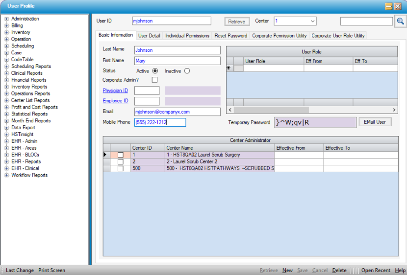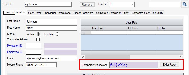 . These will only be visible on this tab when saving a newly created User Profile or for Password Reset. - An e-mail must be entered for the User on the Basic Information tab in order to use the EMail User button. Click the Email User button to e-mail the temporary password to the Email saved in the User Profile.