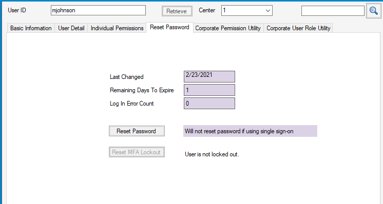 This button is only enabled if Multi-Factor Authentication (MFA) is enabled at a center this user has access to and their account is locked. When an account is not locked, the following message will display next to the button: User is not locked out. When the account is locked the message next to the button displays: Account is locked. When this button is clicked, the account is reset and the message will display The Account has been reset. This option can be accessed by those users who have permission to Reset Passwords. The hover message for this button reads Reset MFA Lockout Only. This option does not affect user passwords.