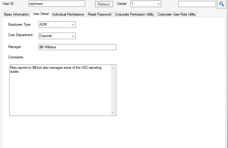 Managers and Security Administrators must be set as Center Administrators on this first tab in order to create and/or maintain additional users.