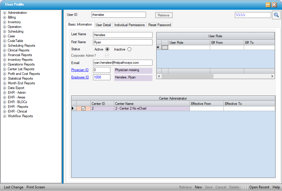 This gives the Super User full access to User Profiles, and from there they will see all the Centers on that database and be able to create and maintain all aspects of the User Profile form.